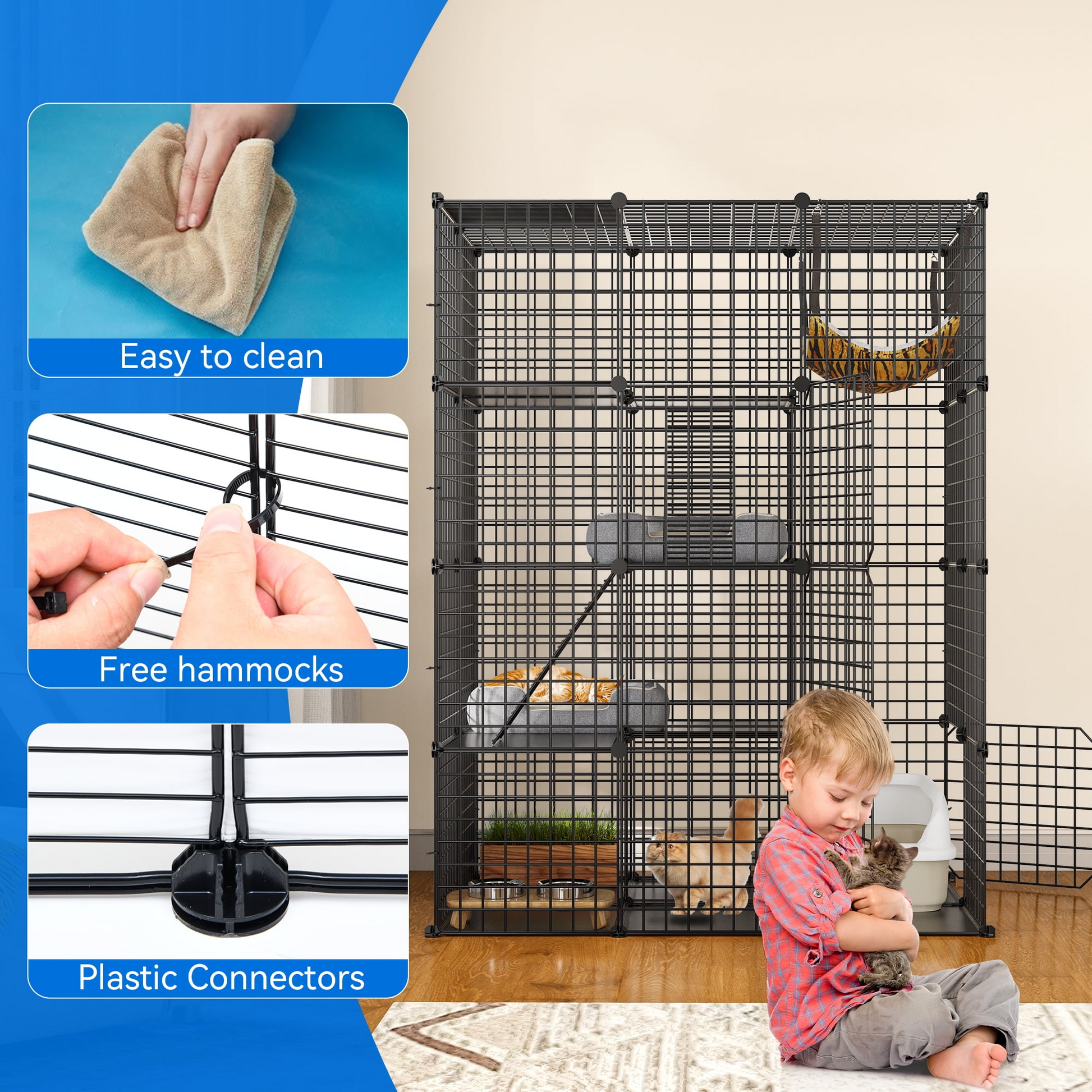 This Cat Playpen is a high-quality finished metal mesh. The specially designed structure will keep your pets safe and comfortable. The hammock and bedding are machine-washable two-layer polyester fabric for easy cleaning. There are two doors with two latches each for added safety and protection of your pets. The kitten playpen has four tiers for added interest, with a resting area at each level, accessed by the three strong ladders. The hammock swings gently and will become a favorite lookout area for your pet.