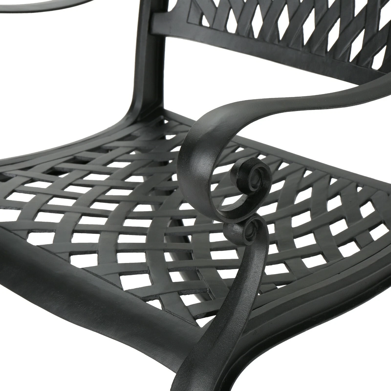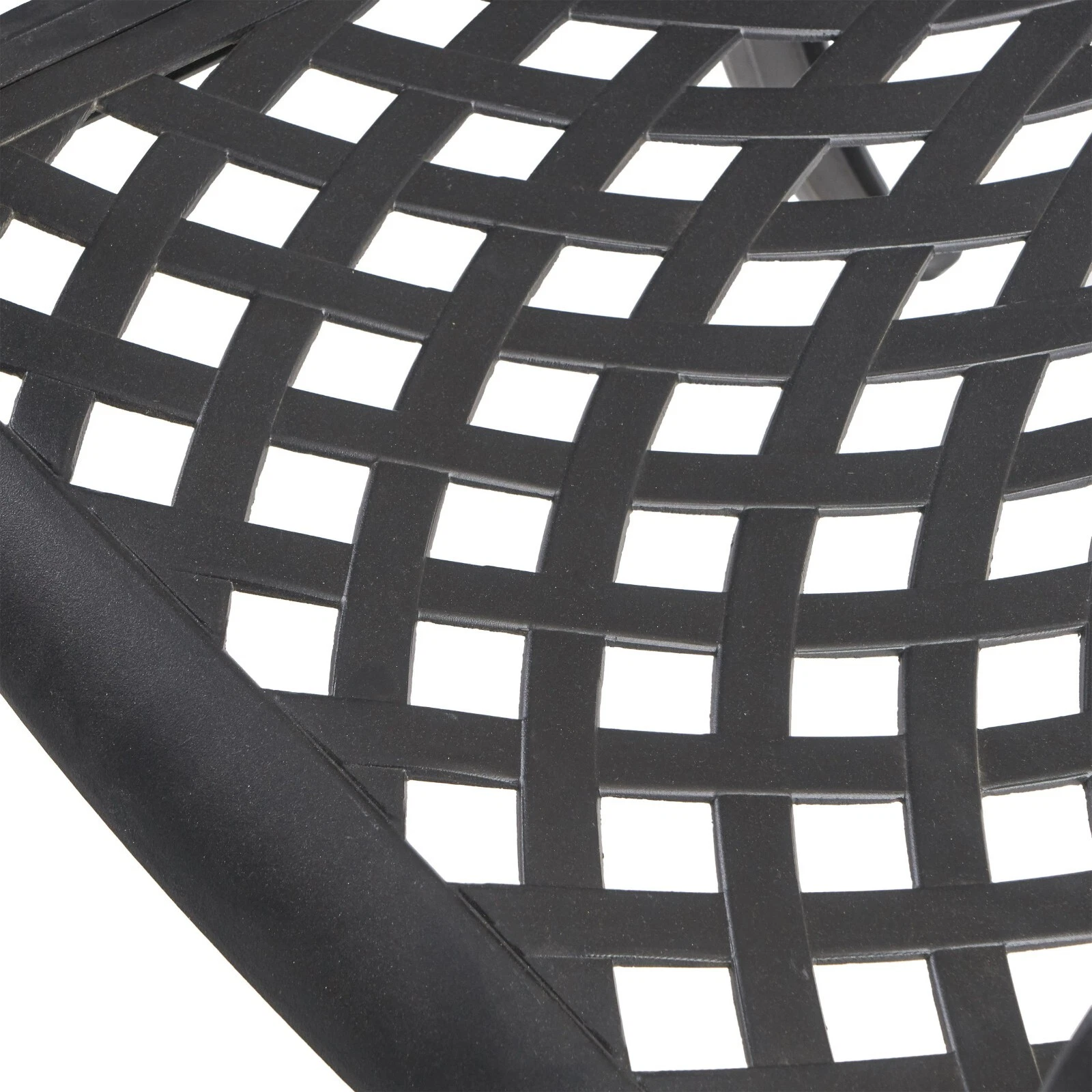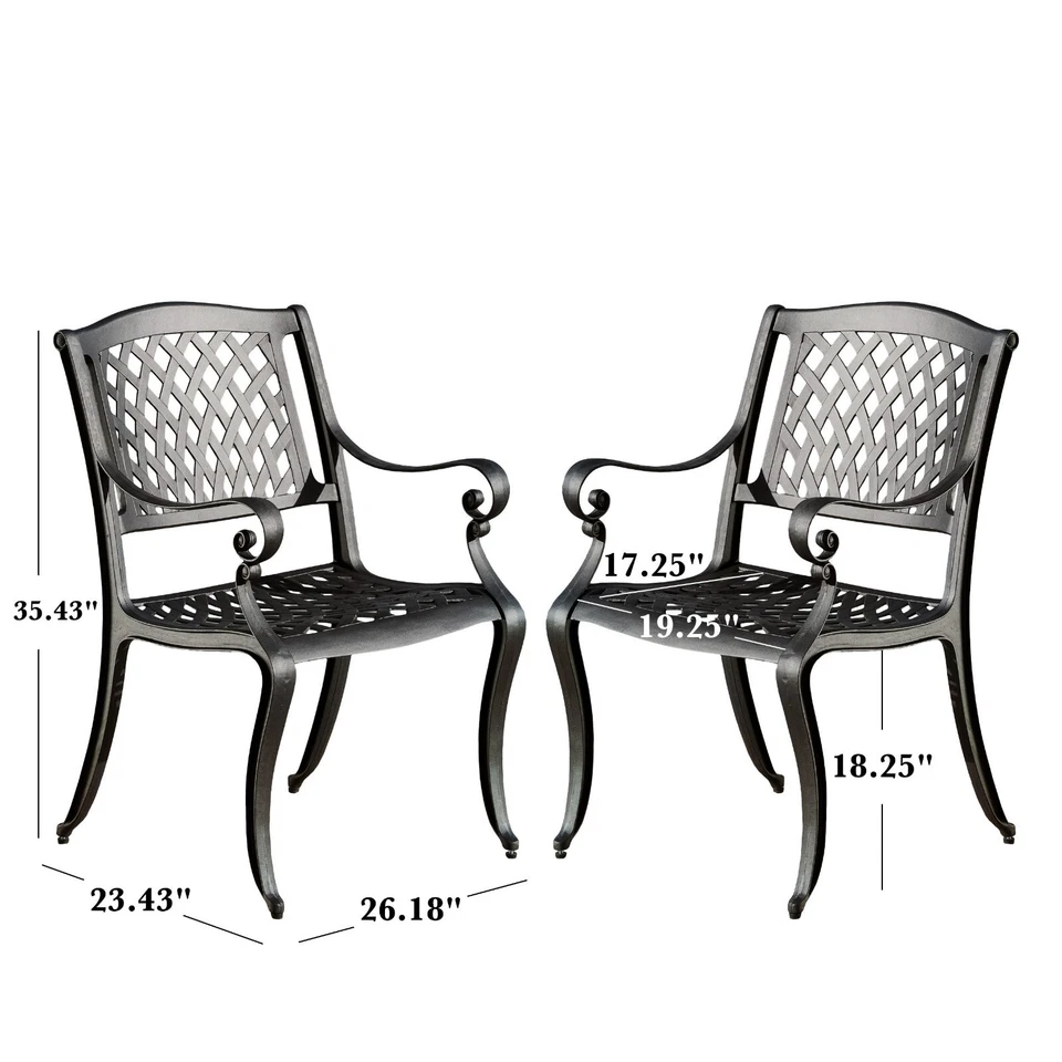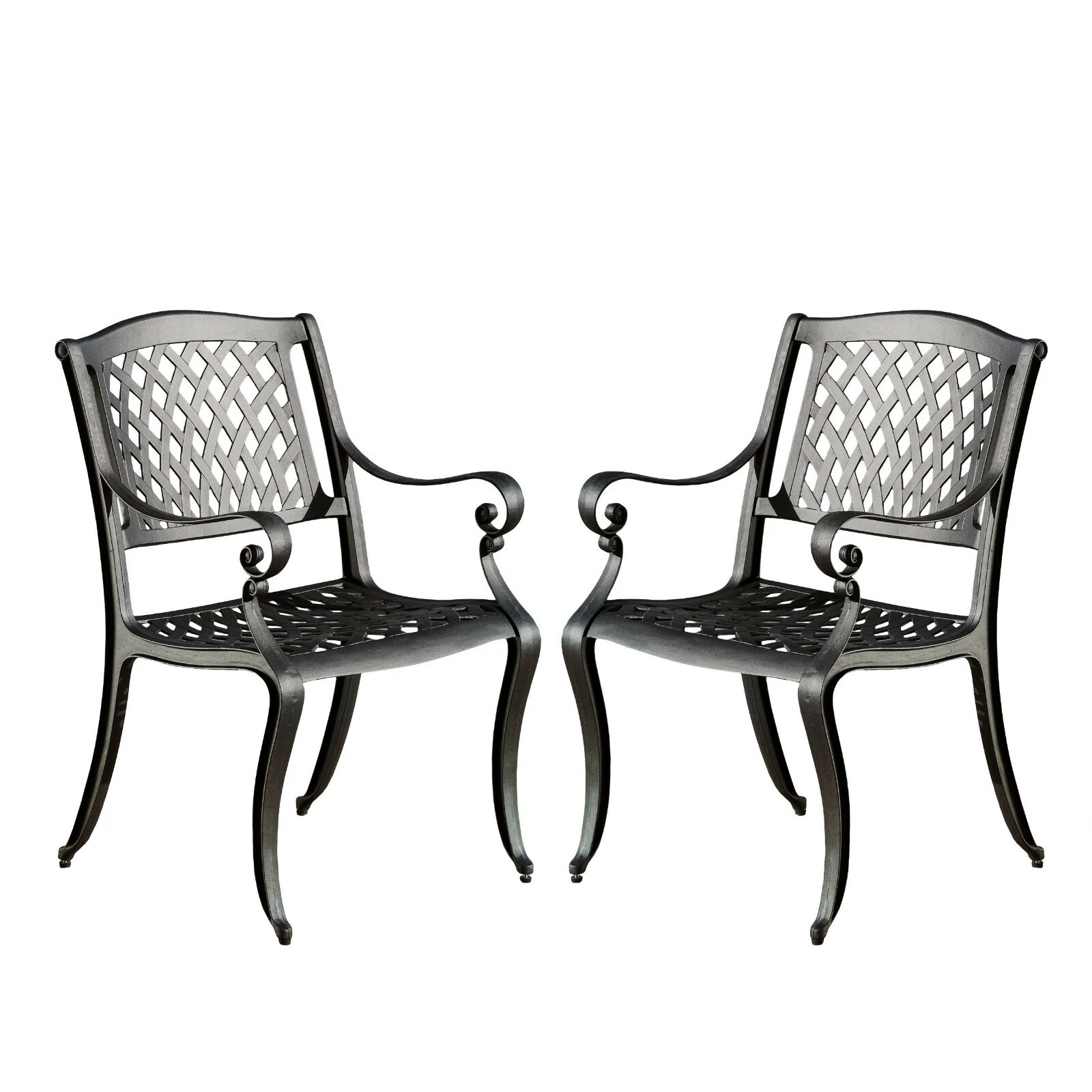Enhance your pool area, patio, deck, or lawn with this stylish and elegant set of patio dining chairs. Designed to remain outdoors when you need them, these outdoor table chairs are made of high-quality cast aluminum and finished in neutral Black Sand color. These weather-resistant chairs are robust and will be long-lasting. These patio seating chairs are ideal for relaxing with a glass of wine with your partner or friend. The elegant lattice weave on the backrest and seat is very stylish, and the curved arms and legs with scroll detail enhance their look. For your unique look, consider adding cushions.