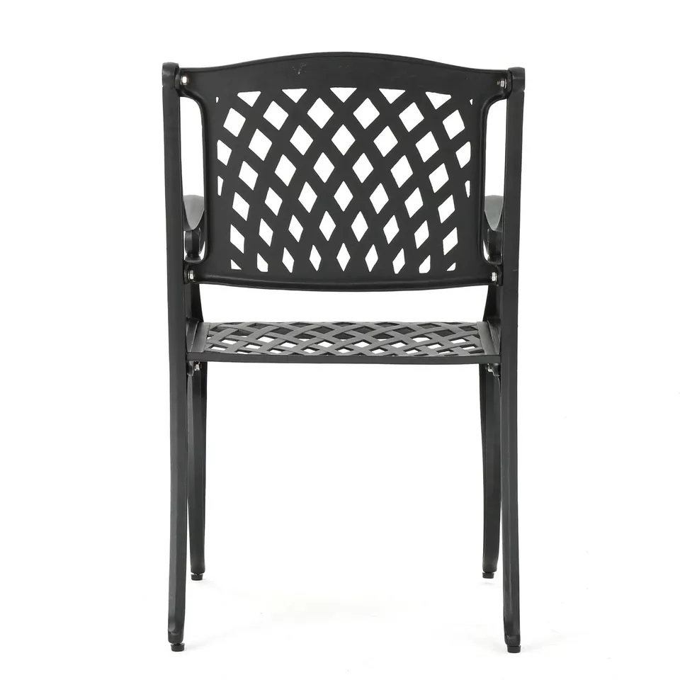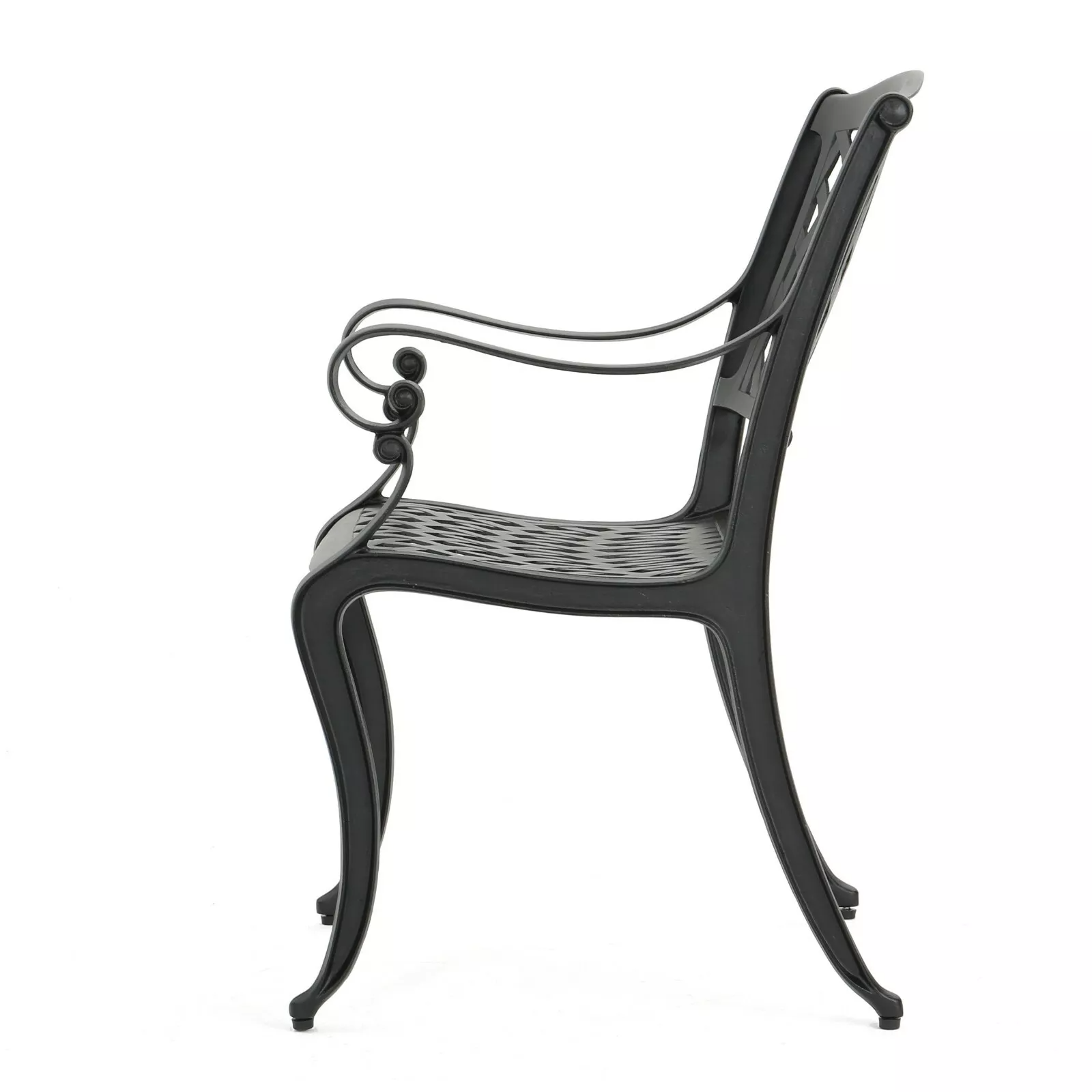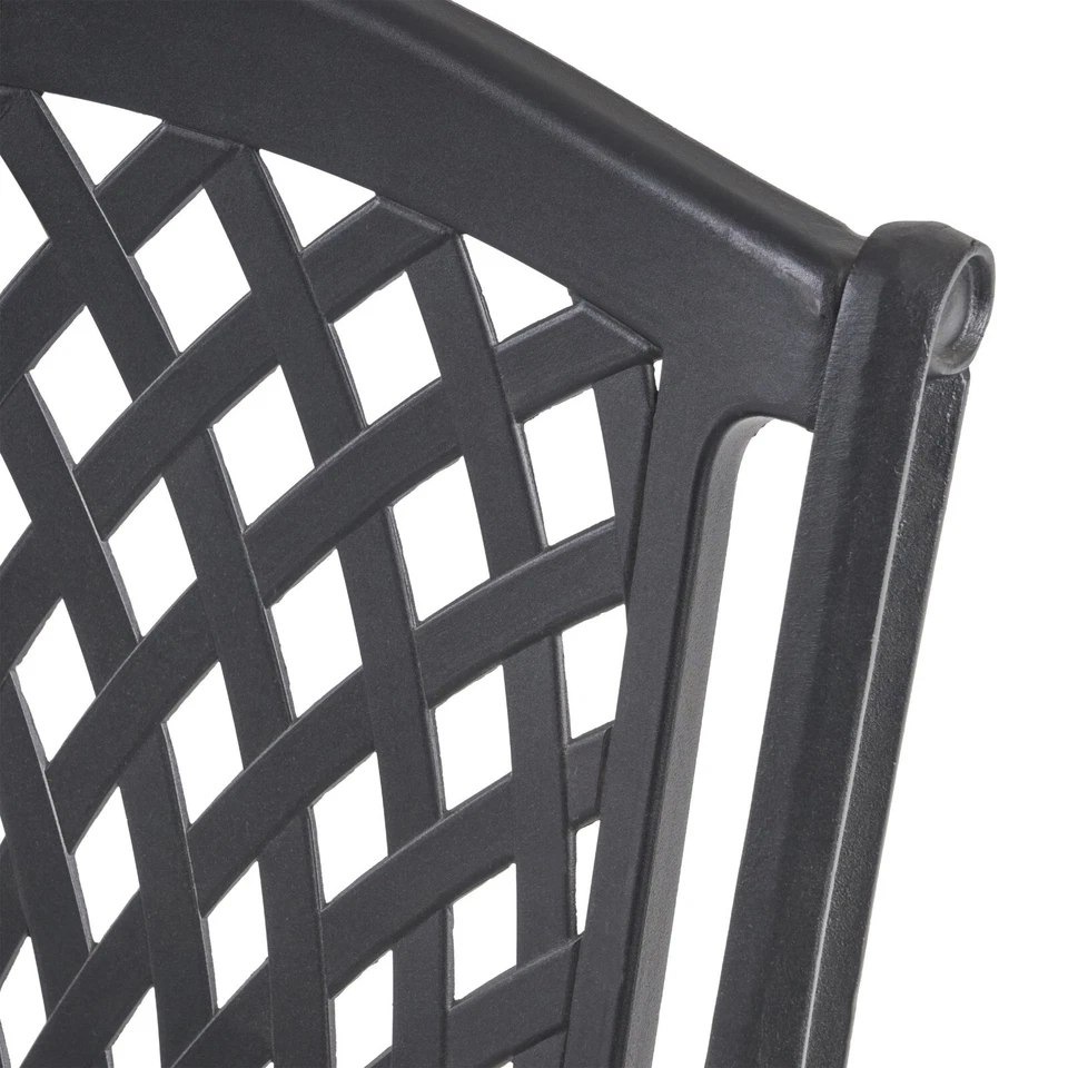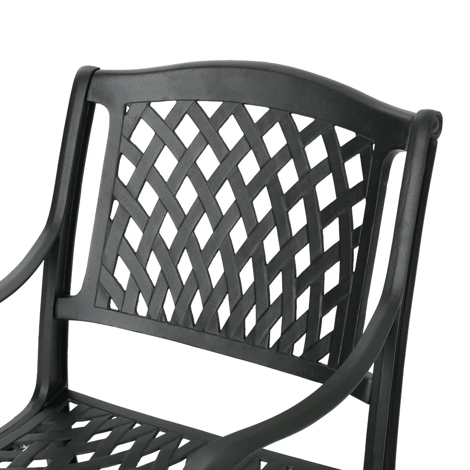 Enhance your pool area, patio, deck, or lawn with this stylish and elegant set of patio dining chairs. Designed to remain outdoors when you need them, these outdoor table chairs are made of high-quality cast aluminum and finished in neutral Black Sand color. These weather-resistant chairs are robust and will be long-lasting. These patio seating chairs are ideal for relaxing with a glass of wine with your partner or friend. The elegant lattice weave on the backrest and seat is very stylish, and the curved arms and legs with scroll detail enhance their look. For your unique look, consider adding cushions.